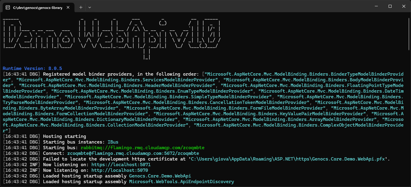 Program.csfile.using Genocs.Core.Builders; using Genocs.Logging; // Setup the logger StaticLogger.EnsureInitialized(); // Create a new WebApplication var builder = WebApplication.CreateBuilder(args); IGenocsBuilder gnxBuilder = builder.AddGenocs(); ... // Add other services // Build the application gnxBuilder.Build();This option will allow you to be able to integrate Microsoft Aspire effortlessly, as well as, you can add the following services: