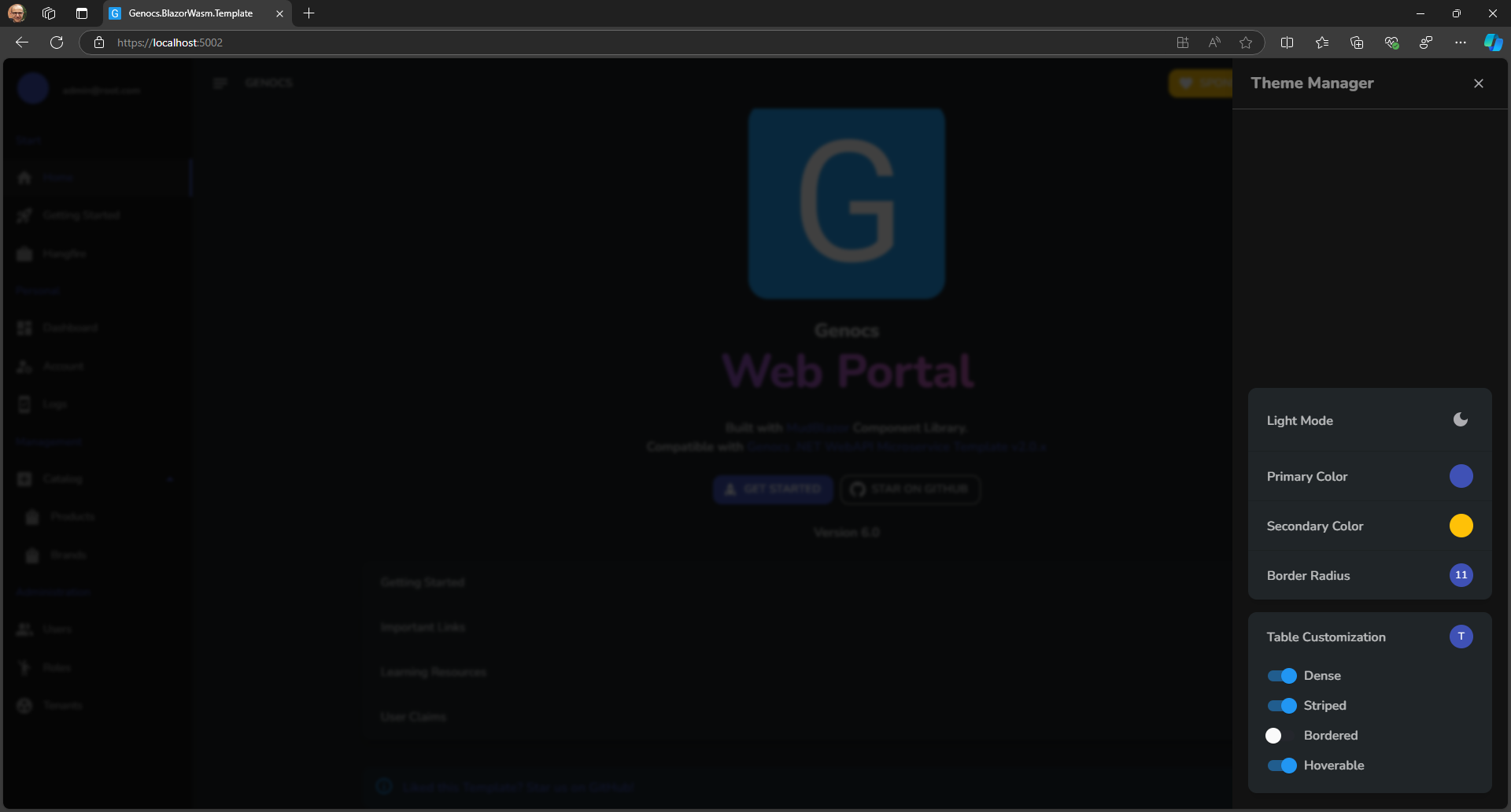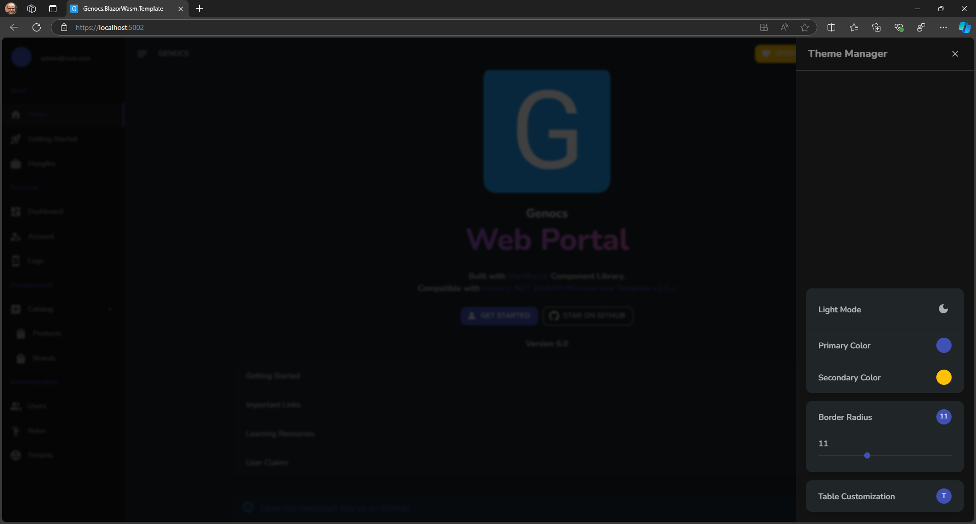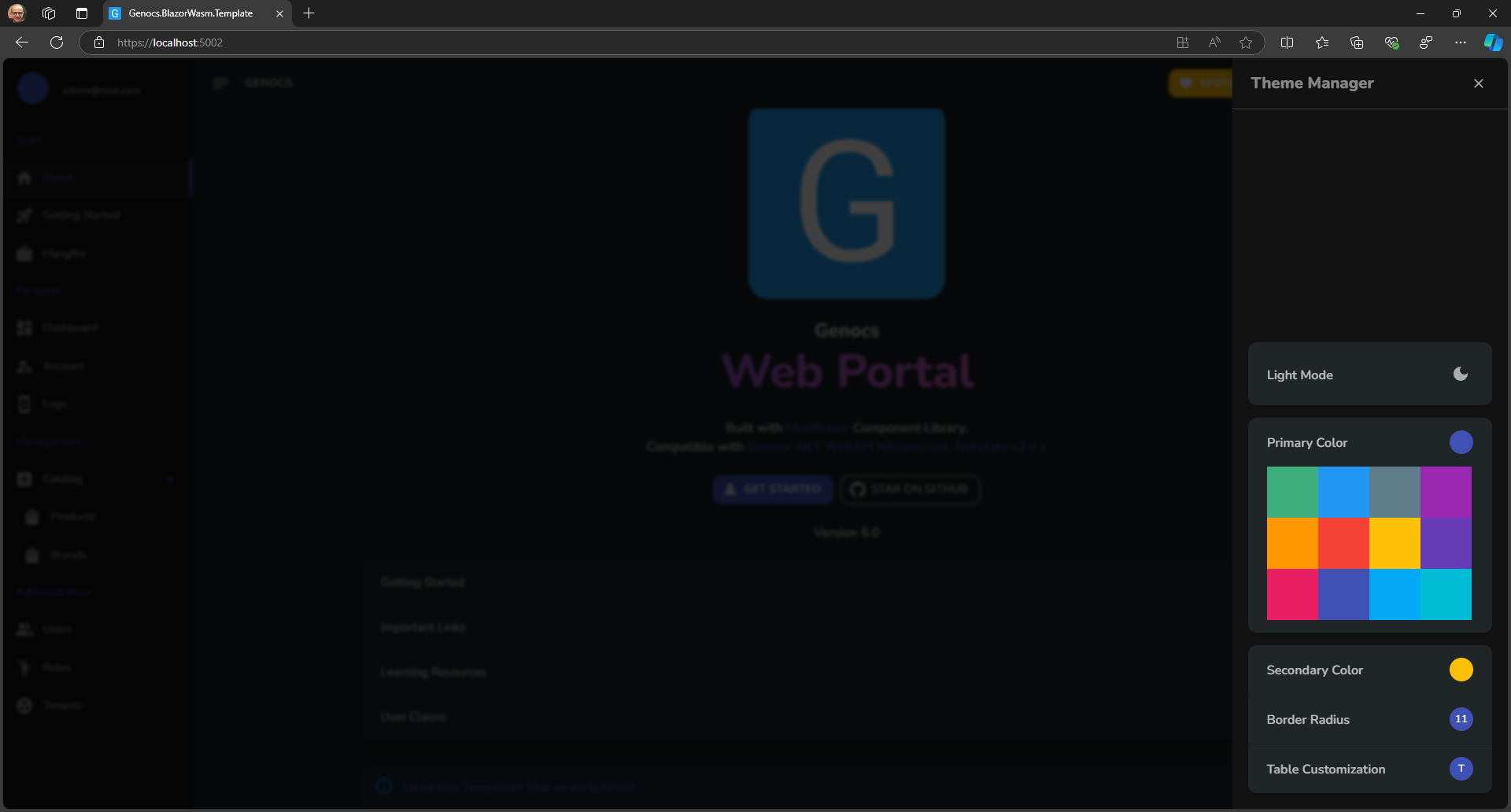 Genocs Library’s Blazor WebAssembly Template comes with a built-in theme manager that helps you customize various UI aspects right from primary colors to the radius of the containers with ease. You can view the Theme Manager component by clicking on the Paint Icon that you would see on every page of the template.