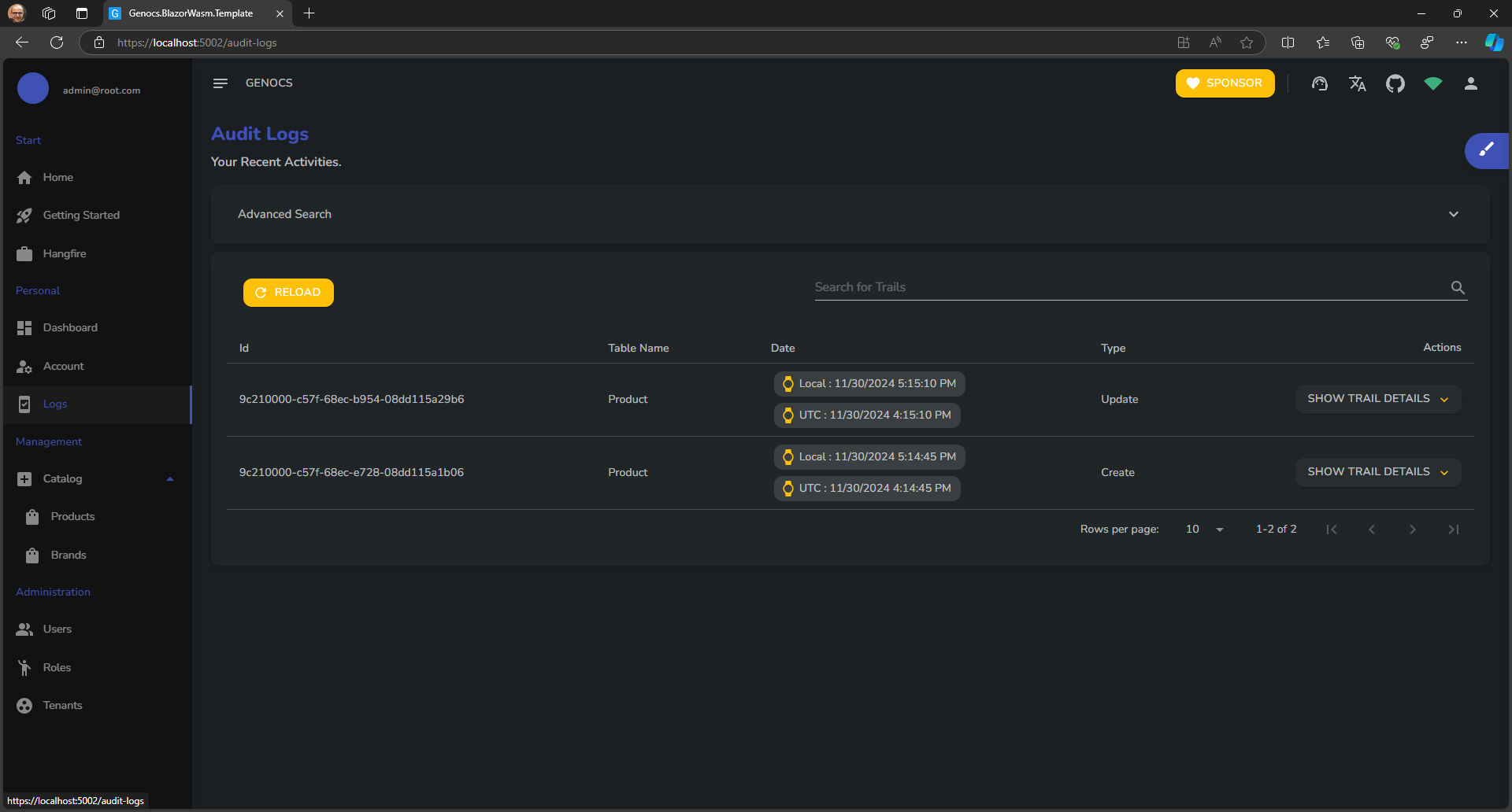 Logs Audit logs #Here is what you would be welcomed with, the audit logs page! You can see the logs of the actions performed by the users in the application. You can also filter the logs based on the user, action, and date range.