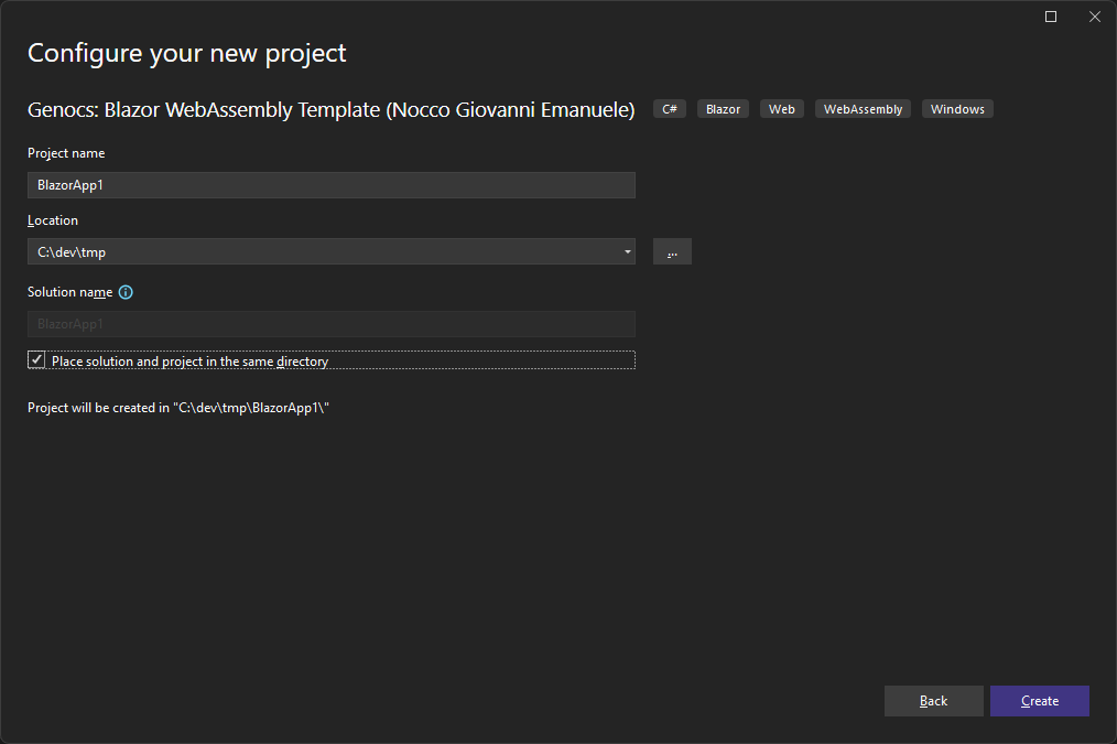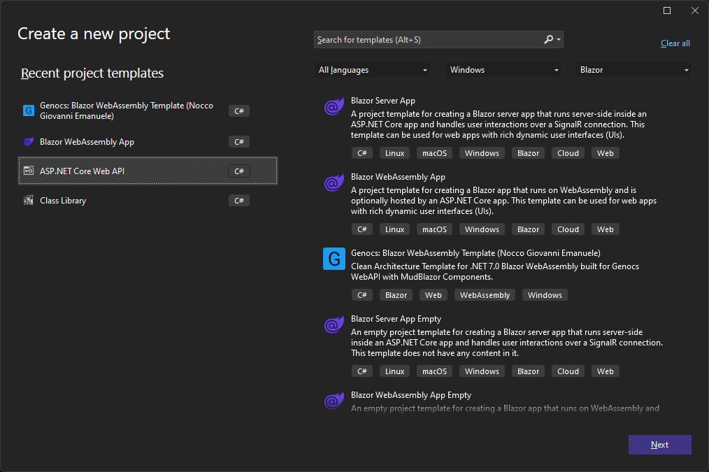 When you installed the NuGet package, there is also an entry that has been created into your Visual Studio Template for Genocs Library’s .NET WebAPI Template. If you find it easier to work with Visual Studio rather than CLI Commands to generate new solutions, you are free to do so.