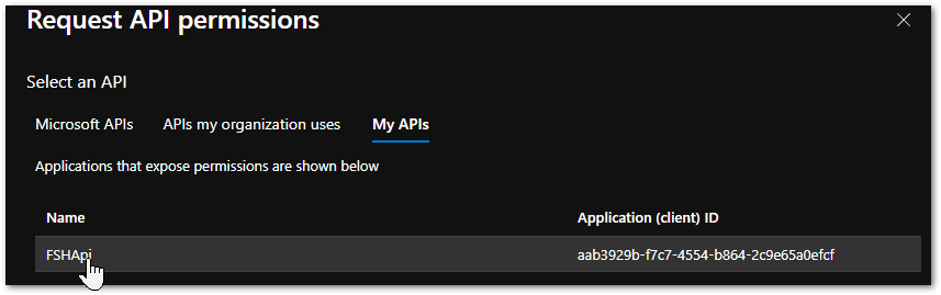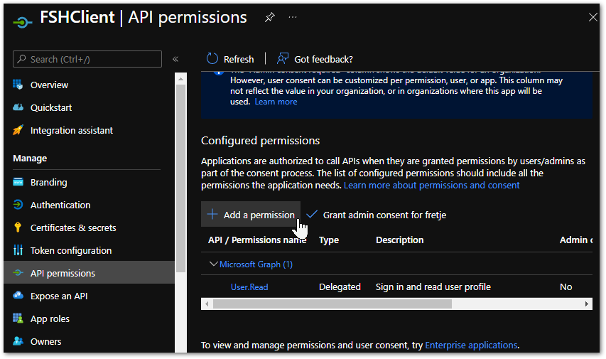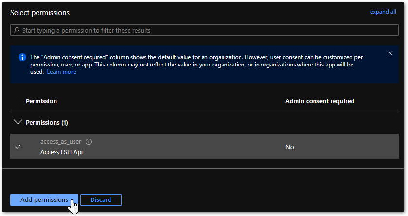 Select permissions, check theaccess_as_userpermission and click onAdd permissions: