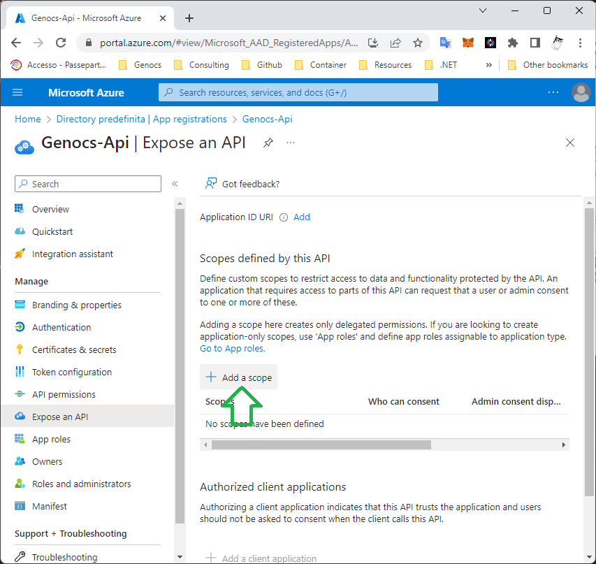 AuthProvider: set toAzureAdAuthority: set tohttps://login.microsoftonline.com/organizationsClientId: set to theApplication (client) IDof the Genocs-Client App registration (or the one you specifically created for the blazor client).ValidateAuthority: set totrueApiScope: set to the full name of the api scope we created in the Genocs-Api App registration (api://<ClientId of the Genocs-Api App registration>/access_as_user) same as before with the swagger client.