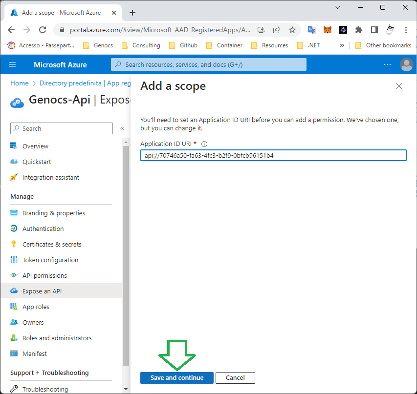 Application ID URIq will automatically be filled out. Click onSave and continue: