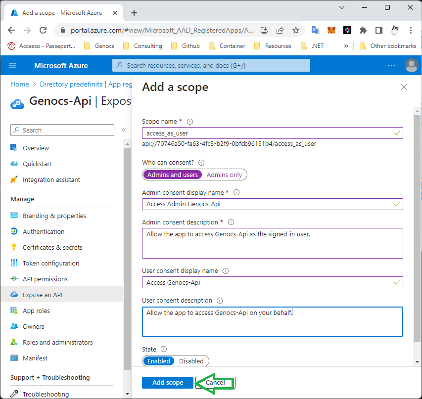 access_as_userasScope name, selectAdmins and usersasWho can consent?and fill out the display names and descriptions like in the screenshot below, then click onAdd scope: