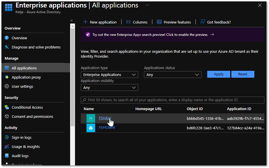 Manageclick onEnterprise applicationsand select the Genocs-Api application: