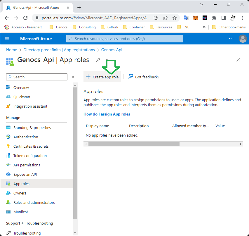 Manage, click onApp rolesand click theCreate app rolebutton on top: