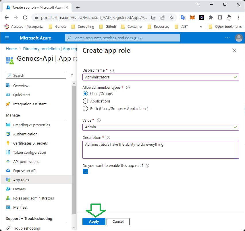 Administratorsas Display name andAdminas value. Especially the value is important, as this has to match the name of the role in the Genocs-Api application itself. Click on Apply: