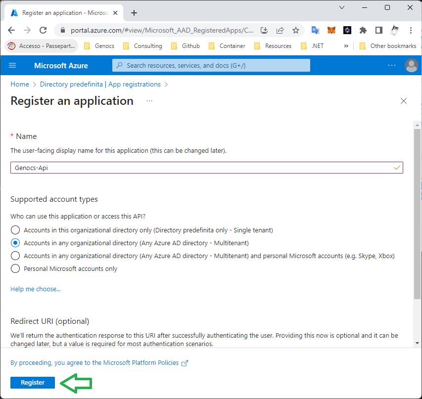 Genocs-Api(or whichever name you want for this app) asName. UnderSupported account typesselectAccounts in any organizational directory - Multitenantand click onRegister: